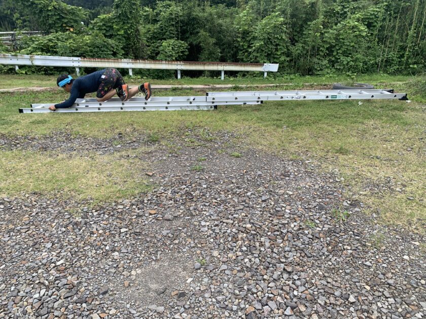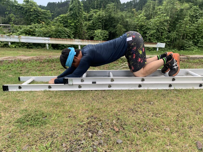 この画像見てもらうとちょうど上部のはしごと真ん中のはしごが重なっている所に身体がきています。