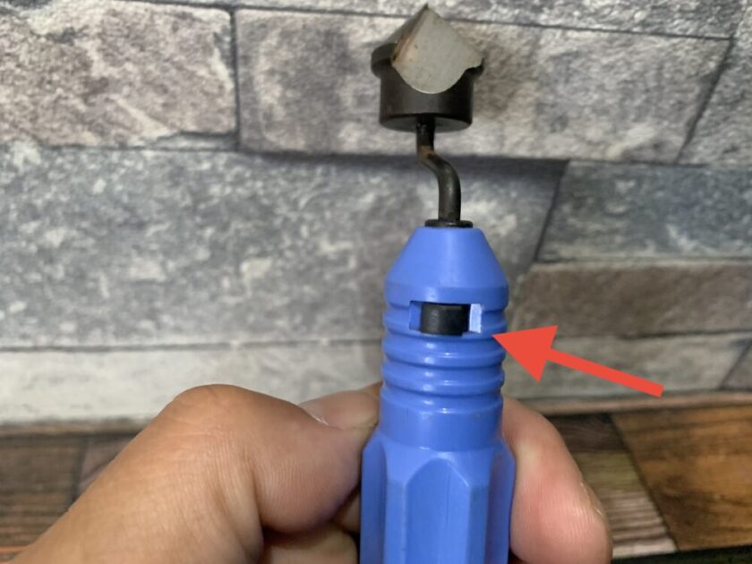 刃を交換する時は黒いつまみ【赤矢印】を押すだけ。