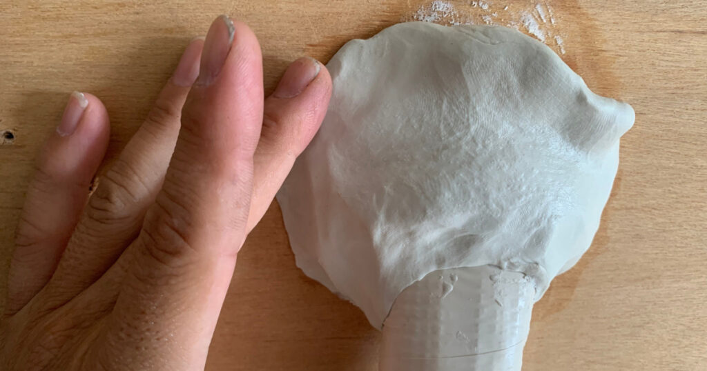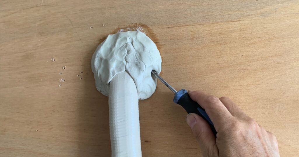 ②配管部分にパテを巻き付けるのに、凹みを作る。