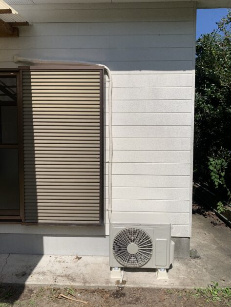 外の状況も見ていきましょう。配管穴から配管類を右に1mほど横引きして、そのあと戸袋の横側に沿って下ろしています。