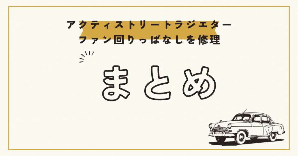 ここではアクティストリート(HH3)のラジエターファンが回りっぱなしの修理方法を紹介させて頂きました。